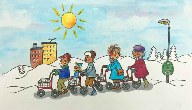 Wow, den här boken är så inspirerande – det är ett helt nytt tankesätt att se sin rullator som ett träningsredskap och inte bara som ett hjälpmedel. Väldigt praktiskt att ha med sig sitt eget rullande gym, var man än är, och de härliga illustrationerna kan ju få vem som helst att bli träningssugen. Det ser så kul ut!
